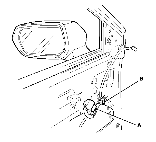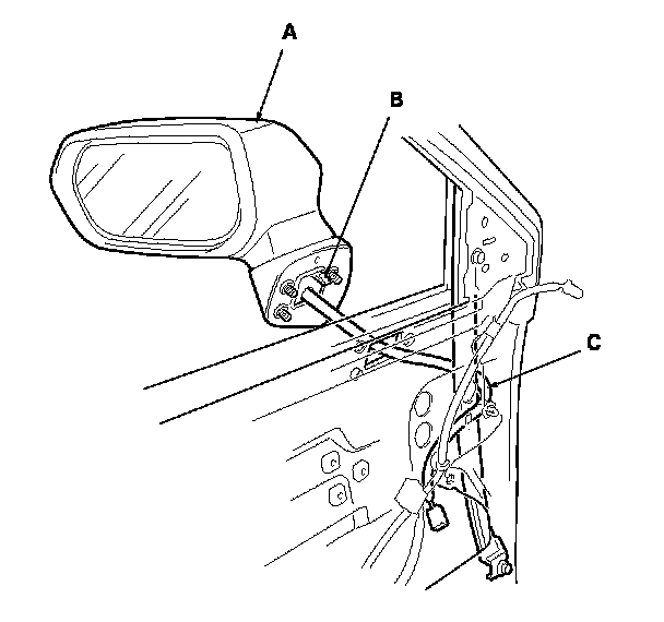 5. While holding the mirror (A), detach the clip (B), then remove the mirror, and pull the harness (C) out through the hole in the door. Take care not to scratch the door.