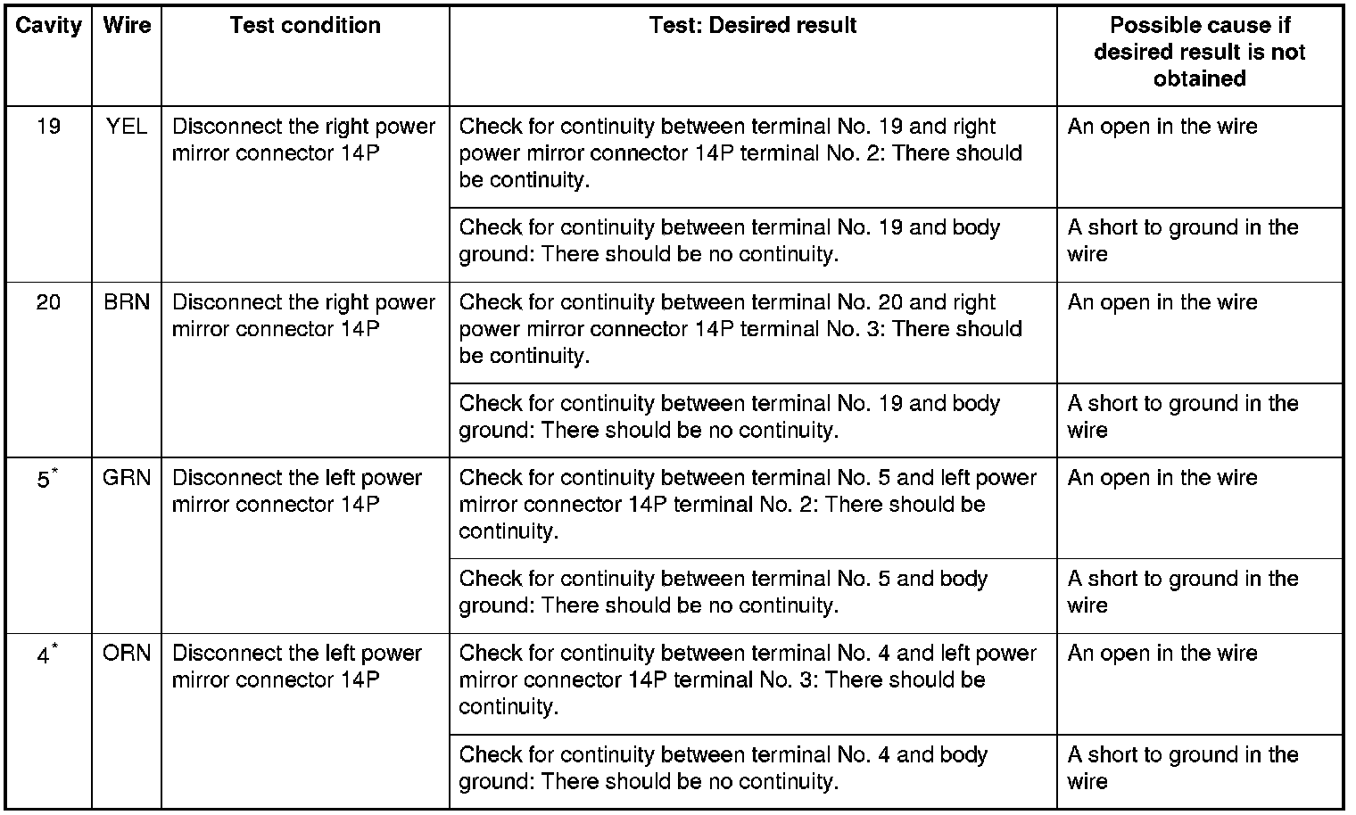 - If all the input tests prove OK, the control unit must be faulty; replace the power mirror control unit.