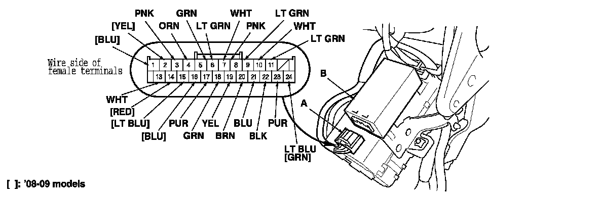5. Check the PCM DTCs. If there is no DTC, jump the SCS line with the HDS, then disconnect PCM connector A (44P) ('07 model), the power seat control unit 40P connector ('08 model), and the power mirror control unit 24P connector.