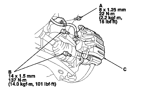 4. Remove the brake caliper bracket mounting bolts (B), and remove the caliper assembly (C) from the knuckle. To prevent damage to the caliper assembly or brake hose, use a short piece of wire to hang the caliper assembly from the undercarriage. Do not twist the brake hose excessively.