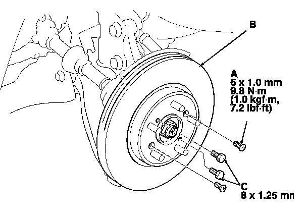 NOTE: If the brake disc has clung to the hub, thread two 8 x 1.25 mm bolts (C) into the brake disc to push it away from the hub. Turn each bolt 90 degrees at a time to prevent the brake disc from binding.