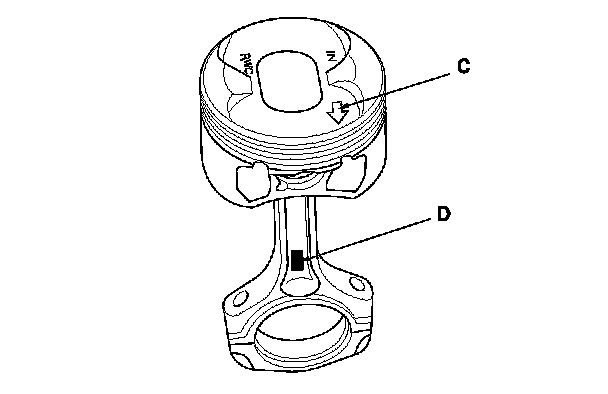 4. Assemble the piston (A) and connecting rod (B) with the arrow (C) and the embossed mark (D) on the same side. Install the piston pin (E).