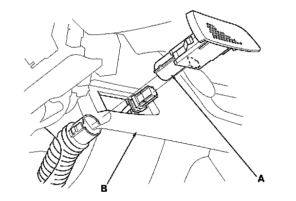 2. Remove the self-tapping screw and the in-car temperature sensor (A) from the instrument panel (B).