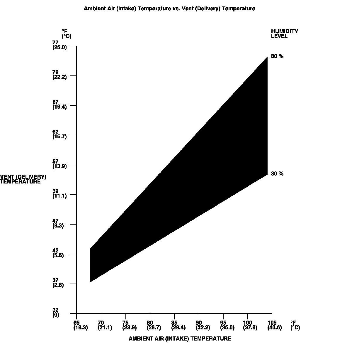 NOTE: The vent temperature and ambient air temperature should intersect in the shaded area. Any measurements outside the area may indicate the need for further inspection.