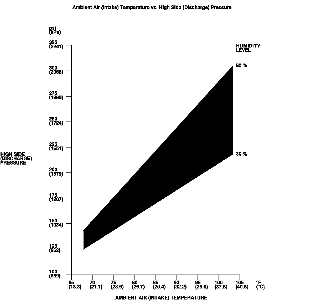 NOTE: The high side pressure and ambient air temperature should intersect in the shaded area. Any measurements outside the area may indicate the need for further inspection.