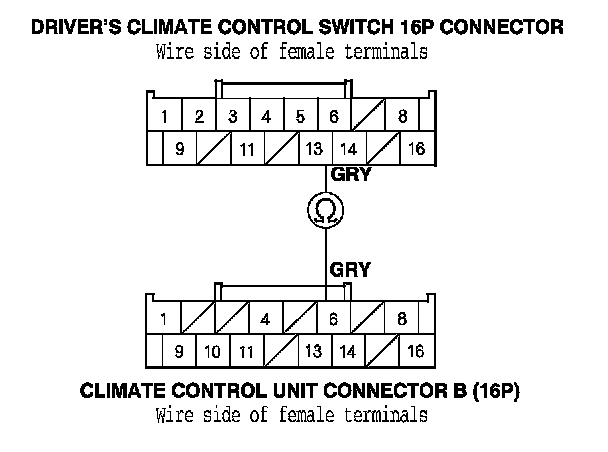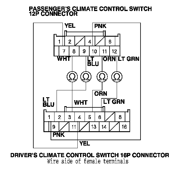 9. Check for continuity between the passenger's climate control switch 12P connector and the driver's climate control switch 16P connector as shown.