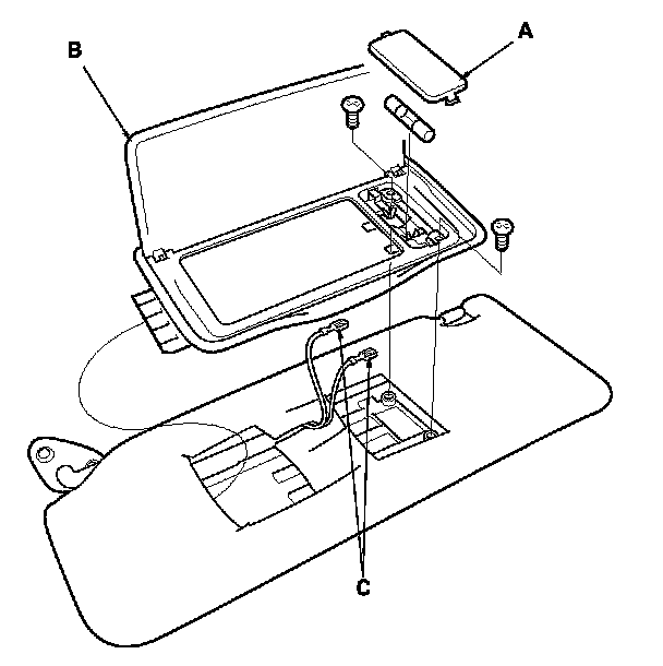 9. If the continuity is not as specified, check the bulb or the light. If the bulb or light is OK, replace the sunvisor.