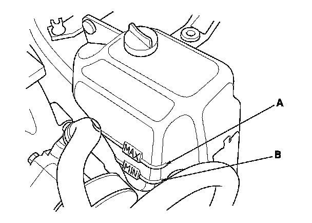 1. Check at the coolant level in the coolant reservoir. Make sure it is between the MAX mark (A) and MIN mark (B).