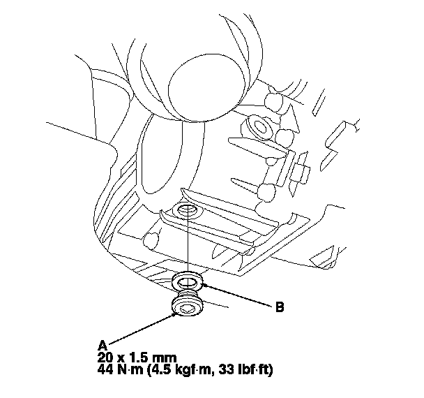 4. Reinstall the drain plug with a new sealing washer (B).