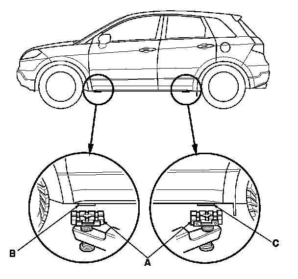 1. Position the lift blocks (A) under the vehicle's front support points (B) and rear support points (C).