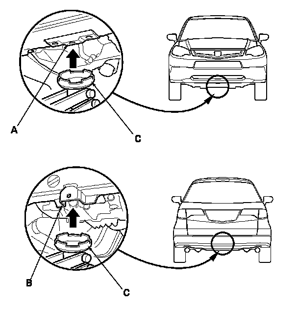 3. Position the floor jack under the front jacking bracket (A) or the rear jacking bracket (B). Center the jacking bracket on the jack lift platform (C), and jack up the vehicle high enough to fit the safety stands under it.
