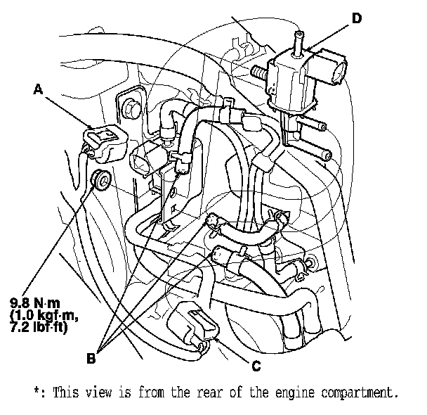 3. Disconnect the hoses (B), and the turbocharger boost control valve connector (C).