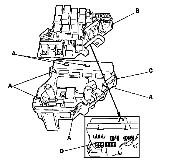 4. Turn the housing over again. Using two flat-tip screwdrivers, release the tabs (A), and pry up the fuse/relay box base (B) from the fuse/relay box housing (C).