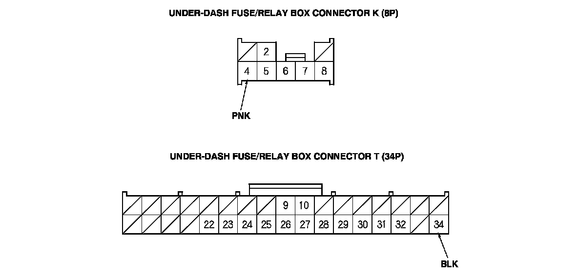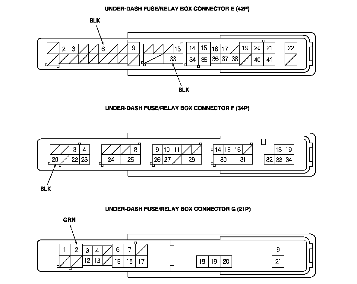 3. Disconnect under-dash fuse/relay box connectors E, F, G, K, and T.