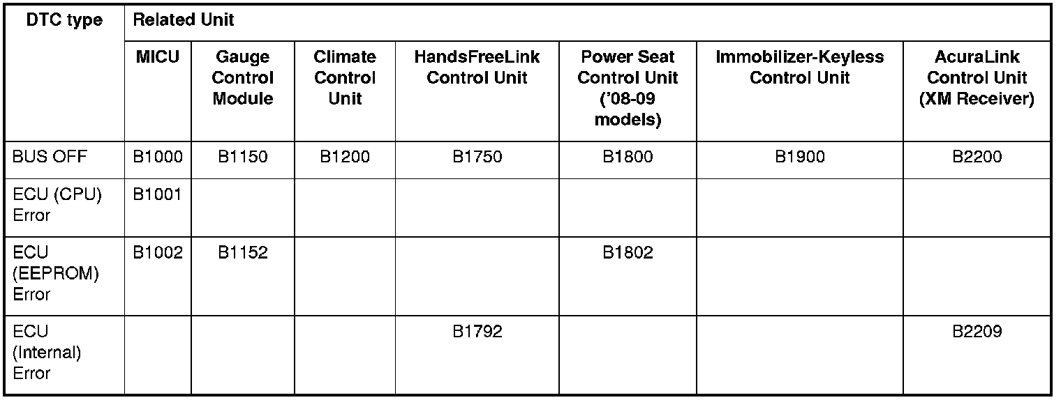 Enter the B-CAN System Diagnosis Test Mode 1. Troubleshooting - B-CAN System Diagnosis Test Mode 1 and Test Mode 2 (without the HDS) While in Test Mode 1, the DTCs which have been detected and stored individually by various B-CAN (Body-controller Area Network) units, will be shown one by one on the LCD display when the communication between the MICU and the gauge control module is normal. To scroll through the DTCs, press the select/reset button.