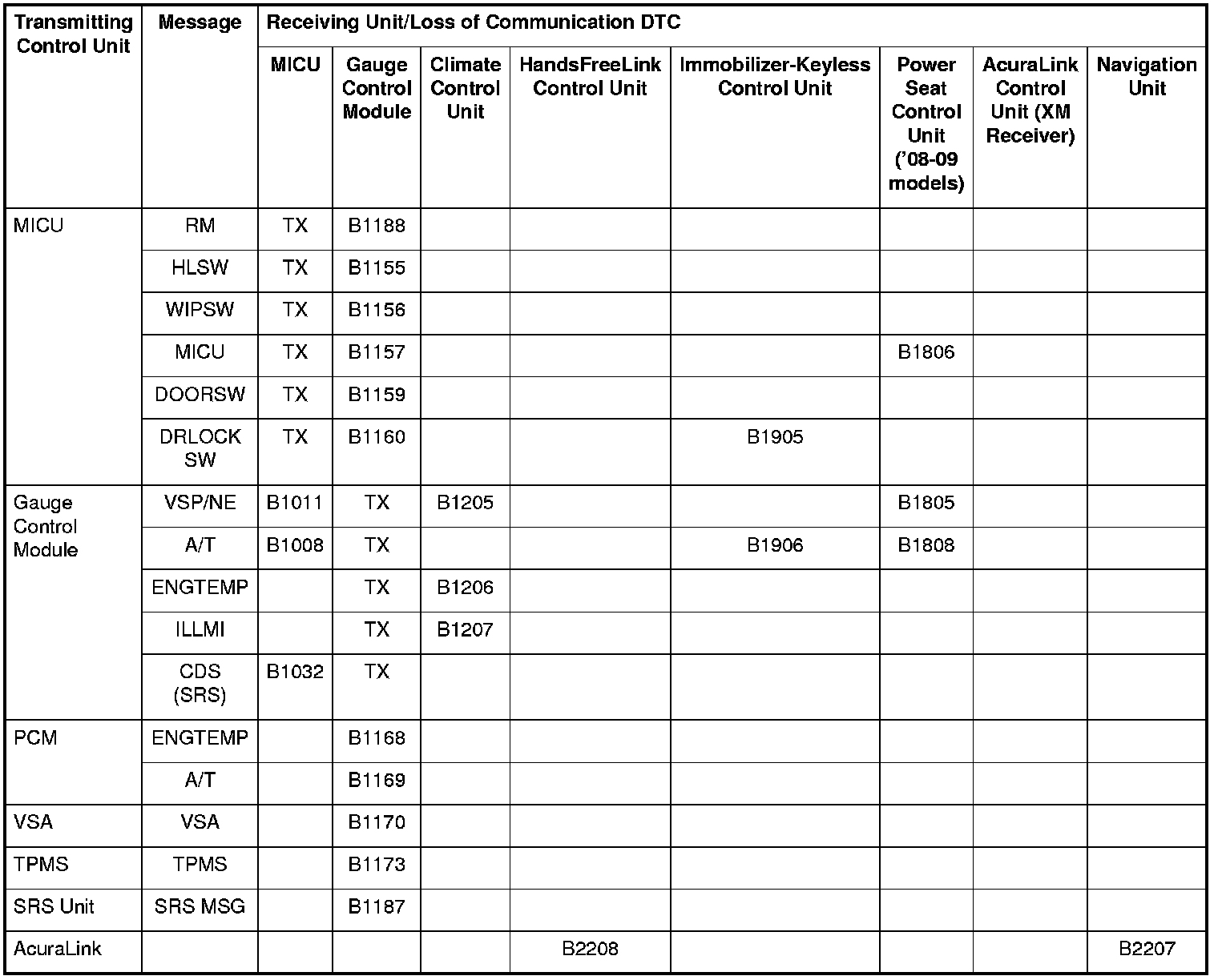 When an ECU is unable to communicate with the other ECUs on the CAN circuit, the other control units will set loss of communication DTCs. Use this chart to find the control unit that is not communicating.