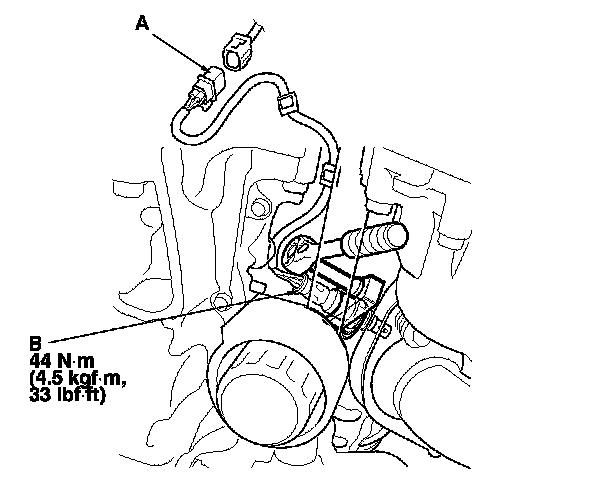2. Disconnect the secondary HO2S 4P connector (A), then remove the secondary HO2S (B).