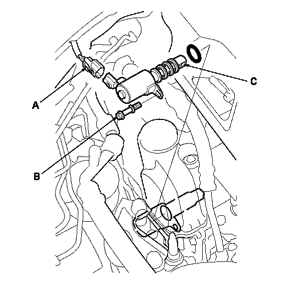 2. Remove the bolt (B) and the VTC oil control solenoid valve (C).