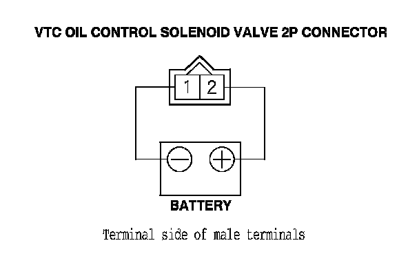 6. Connect the battery negative terminal to VTC oil control solenoid valve 2P connector terminal No. 1.
