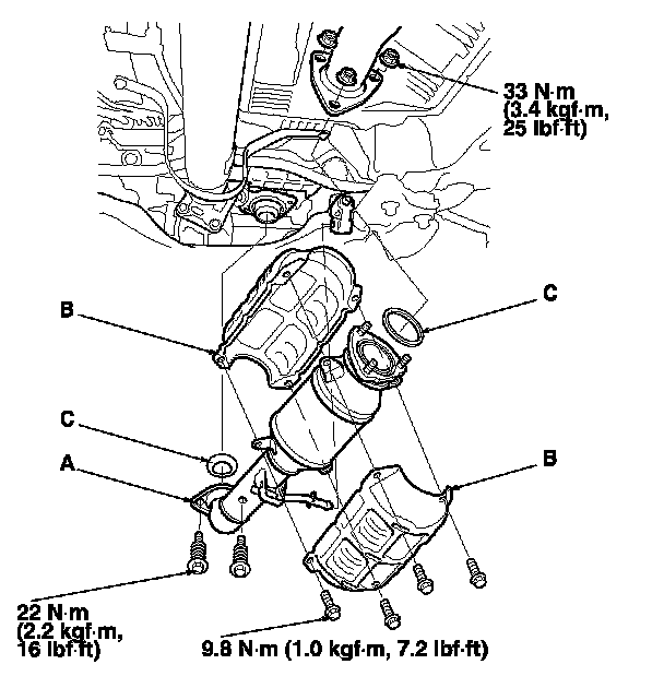 Install the parts in the reverse order of removal with new gaskets (C).