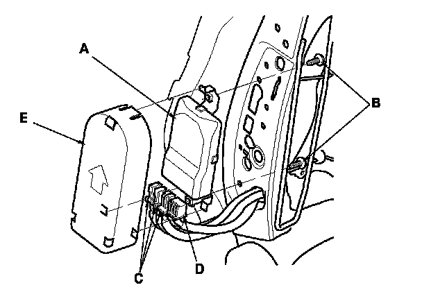 1. Place the new ODS unit (A) on the seat-back frame. Tighten the two screws (B), and connect the sensor connectors (C) and ODS unit 18P connector ('07-08 models) or front passenger's seat wire harness 18P connector ('09 model) (D) to the ODS unit. Reinstall the cover (E).