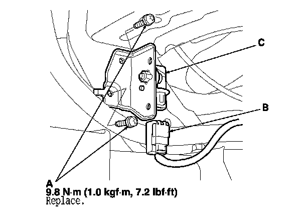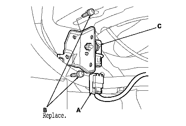 1. Install the new front impact sensor with new TORX bolts (A), then connect the engine compartment wire harness 2P connector (B) to the front impact sensor (C).