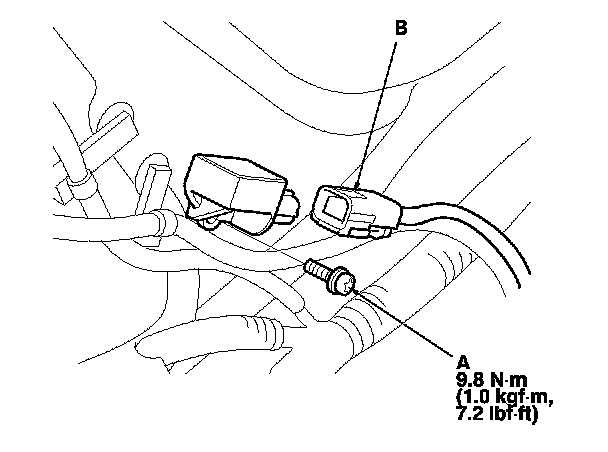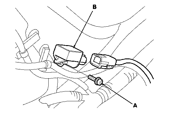 1. Install the new side impact sensor (first) with the TORX bolt (A), then connect the SRS wire harness 4P connector (B) to the side impact sensor (first).