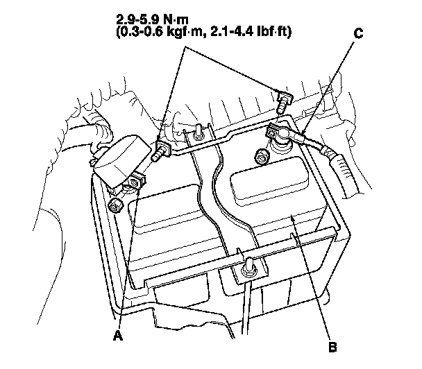 3. Reconnect the positive cable (A) to the battery (B) first, then reconnect the negative cable (C) to the battery.