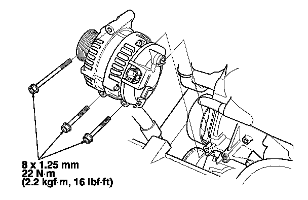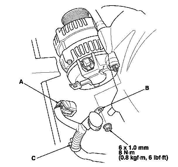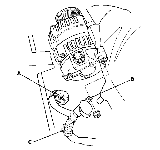7. Disconnect the alternator connector (A) and BLK wire (B), then remove the harness clamp (C) from the alternator.