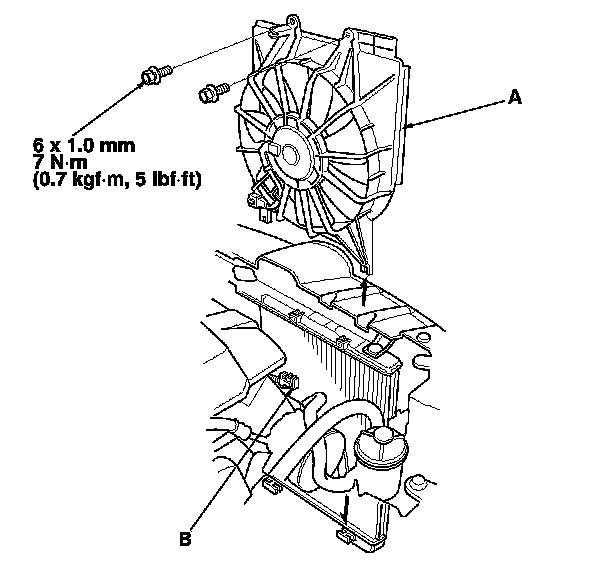 6. Disconnect the A/C condenser fan motor connector (A), then remove the A/C condenser fan shroud assembly (B).