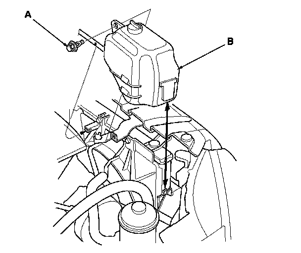 3. Remove the clip (A), then remove the coolant reservoir (B) from the holder.