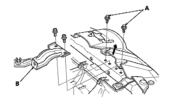 4. Remove the clips (A), then remove the support rod clamp bracket (B).