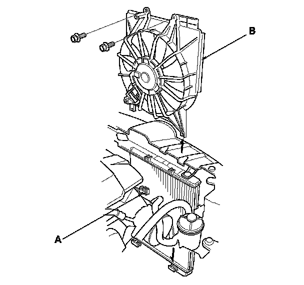 4. Install the A/C condenser fan shroud assembly (A), then connect the A/C condenser fan motor connector (B).