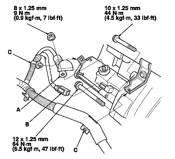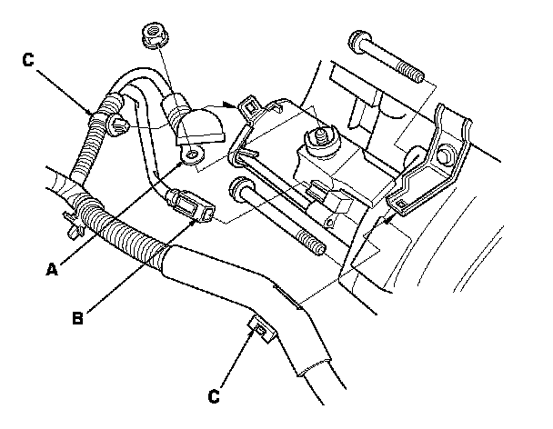 6. Remove the harness clamp (A) and connector (B), then remove the intake manifold bracket (C).