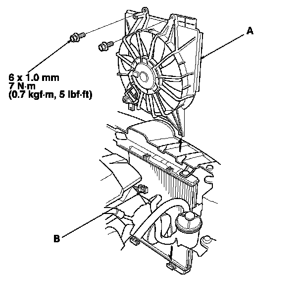 5. Disconnect the A/C condenser fan motor connector (A), then remove the A/C condenser fan shroud assembly (B).