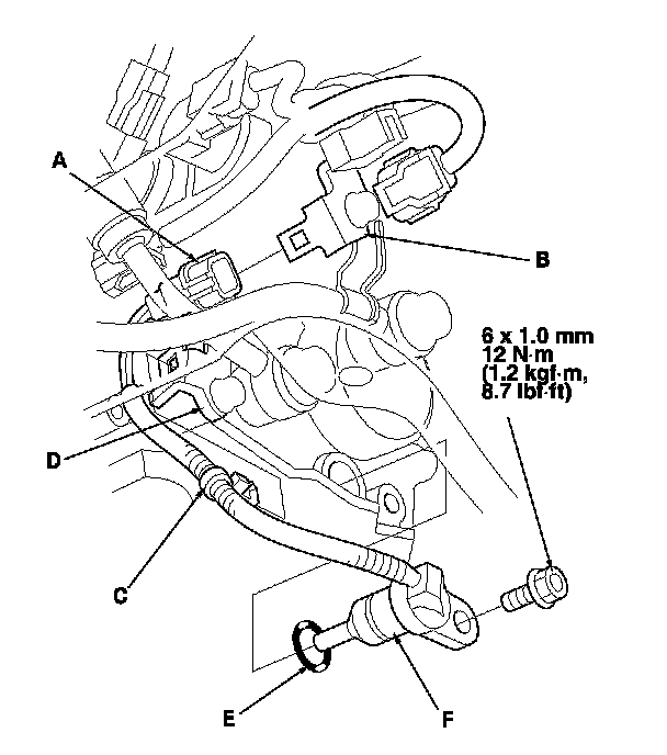 8. Install a new O-ring (E) on a new ATF temperature sensor (F), and install the ATF temperature sensor.