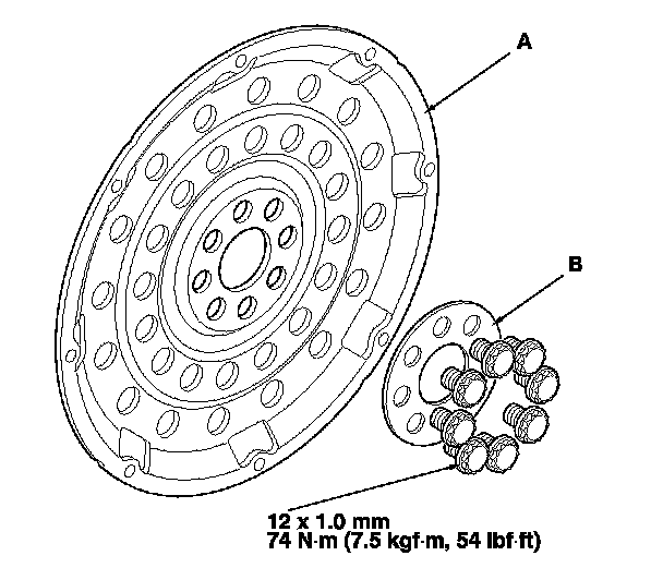 2. Remove the drive plate (A) and washer (B) from the engine crankshaft.