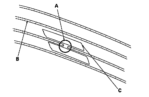 2. Carefully mask above and below the broken portion of the defogger wire (B) with cellophane tape (C).