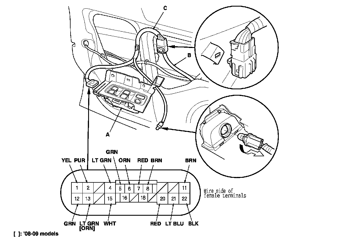 2. Reconnect the driver's door wire harness (B) to the driver's door subharness (C).