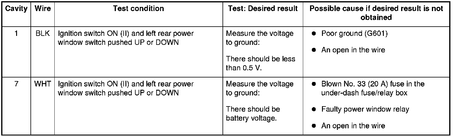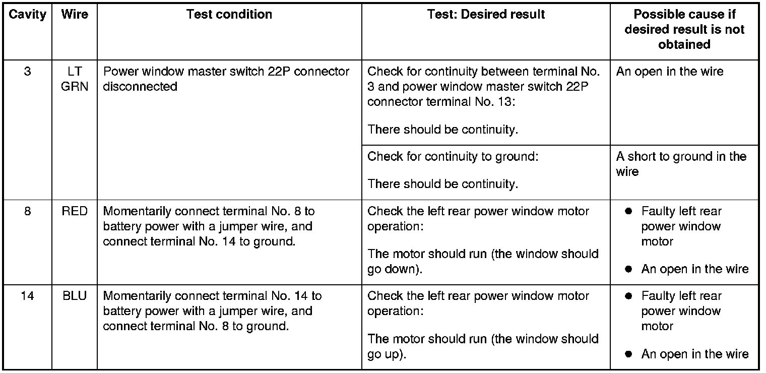 - If all the input tests prove OK, the left rear power window switch must be faulty; replace it.