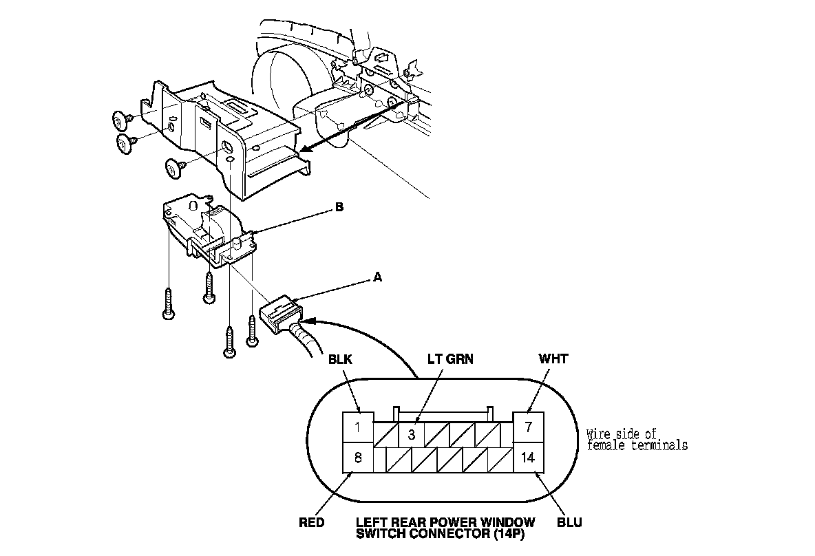 2. Disconnect the 14P connector (A) from the left rear power window switch (B).