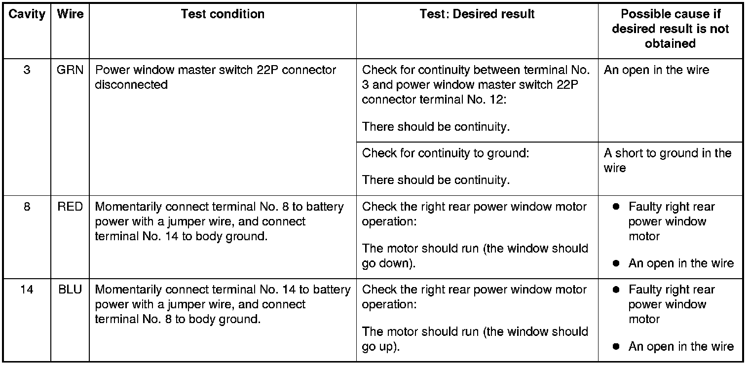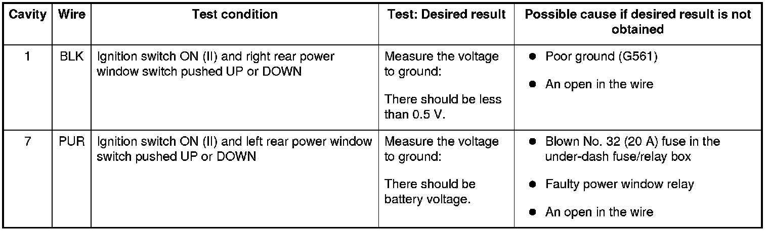 5. Reconnect the connector to the right rear power window switch, and do these input tests at the following connector.