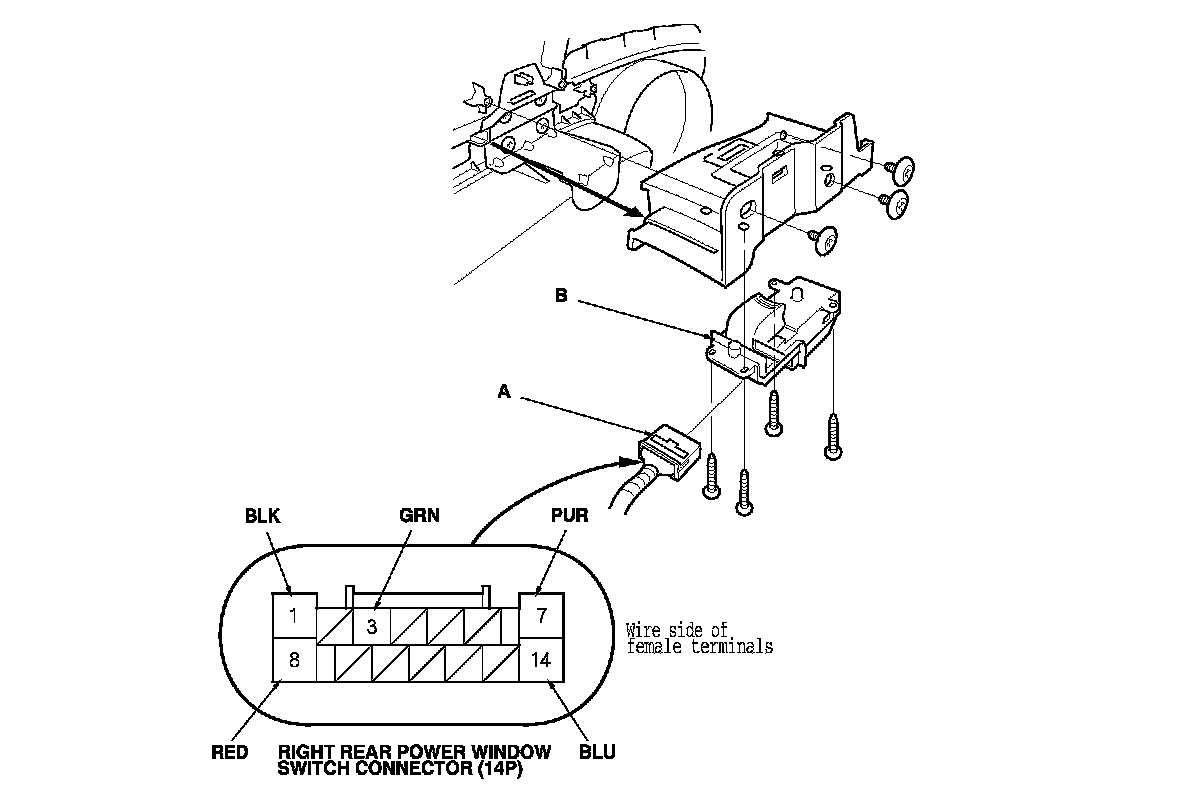 2. Disconnect the 14P connector (A) from the right rear power window switch (B).