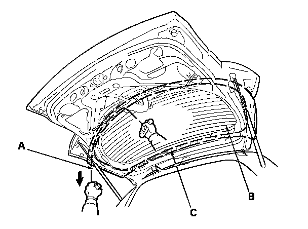 6. With a helper on the outside, pull the piano wire (A) back and forth in a sawing motion. Hold the piano wire as close to the rear window (B) as possible to prevent damage to the tailgate, and carefully cut through the adhesive (C) around the entire rear window.