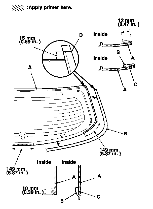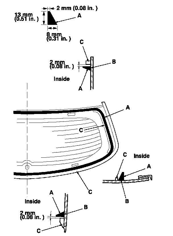 12. Apply primer to the edge of the rear window (A) where the lower rubber dam adhesive tape will be attached as shown. Attach the lower rubber dam (B) with adhesive tape (C) along the edge of the rear window: