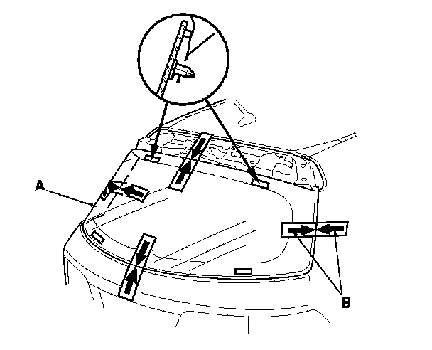 14. If the old glass is used set the rear window (A) in the opening, and center it. Make alignment marks (B) across the rear window and body with a grease pencil at the four points shown. Be careful no to touch the rear window where adhesive will be applied.