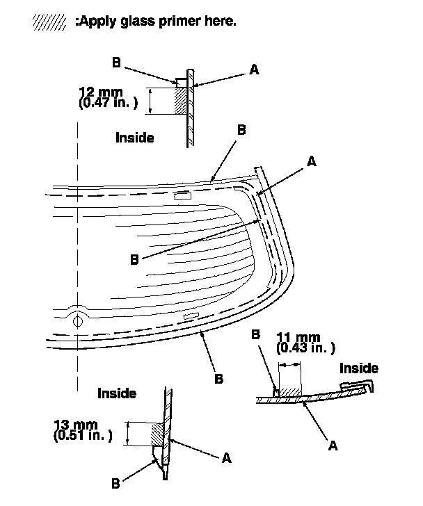 16. With a sponge applicator, apply a light coat of glass primer around the edge of the rear window (A) and along the rubber dams (B) as shown, then lightly wipe it off with gauze or cheesecloth: