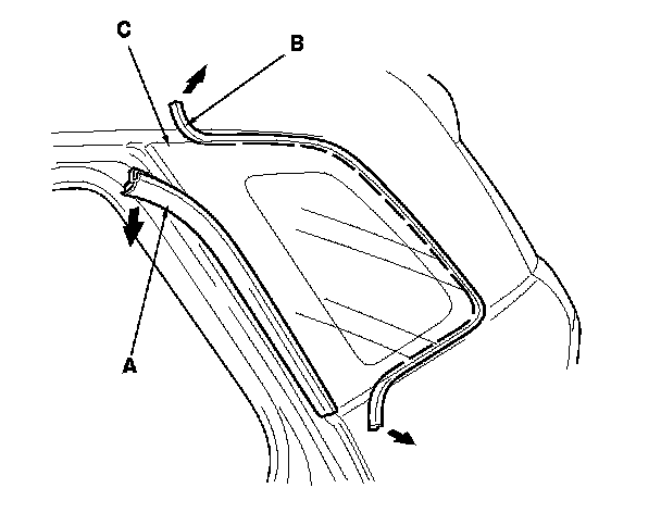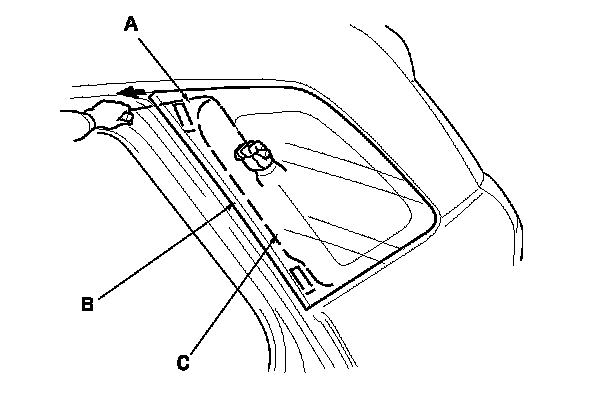 2. Remove the front seal (A) and the molding quarter seal (B) from the front edge of the quarter glass (C). If necessary, cut the seals with a utility knife.