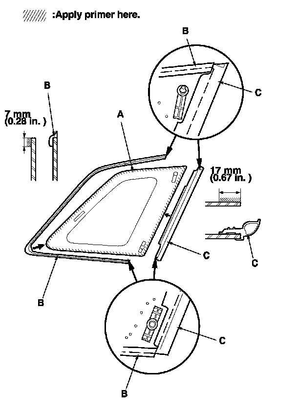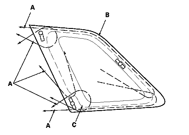 17. Pack adhesive into the cartridge without air pockets to ensure continuous delivery. Put the cartridge in a caulking gun, and run a bead of adhesive (A) along the seals (B) as shown. With the printed dots on the quarter glass (C) as a guide, apply the adhesive to the upper and lower corner portions of the quarter glass. Apply the adhesive within 30 minutes after applying the glass primer. Make a slightly thicker bead at each corner.