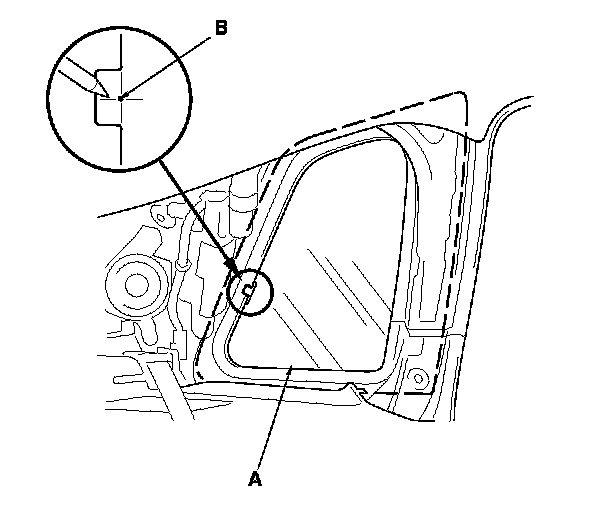 9. Set the quarter glass (A) in the opening, and center it. From inside the vehicle, make an alignment mark (B) to the quarter glass where the rear clip will be installed with a grease pencil. Be careful not to touch the glass where adhesive will be applied.